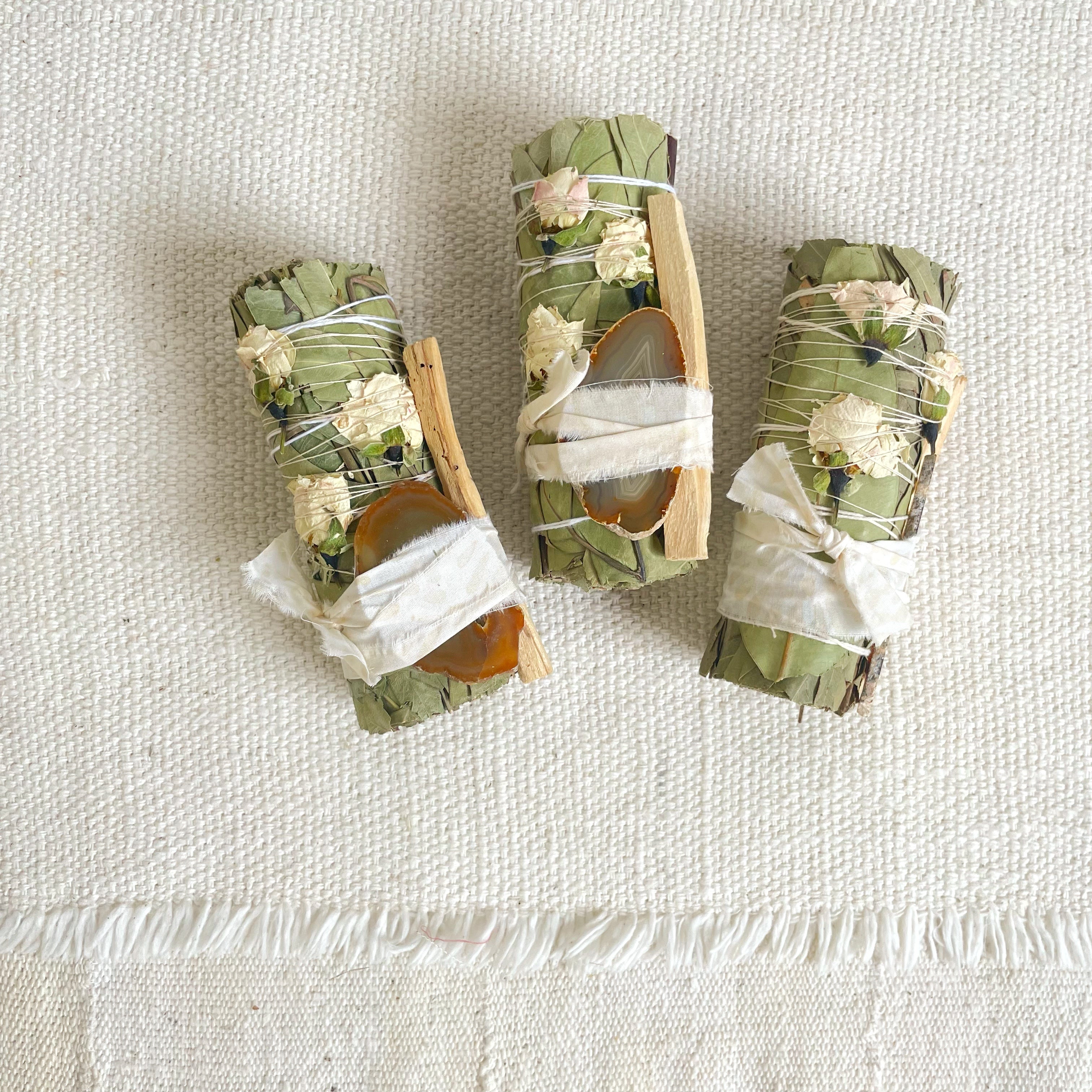 Each bundle has a unique look, no two are exactly alike. They are all wrapped up by hand in our Rochester, NY studio. Every piece is one of a kind, the size of the eucalyptus, palo santo, flowers, and crystals varies, as we work with natural materials.