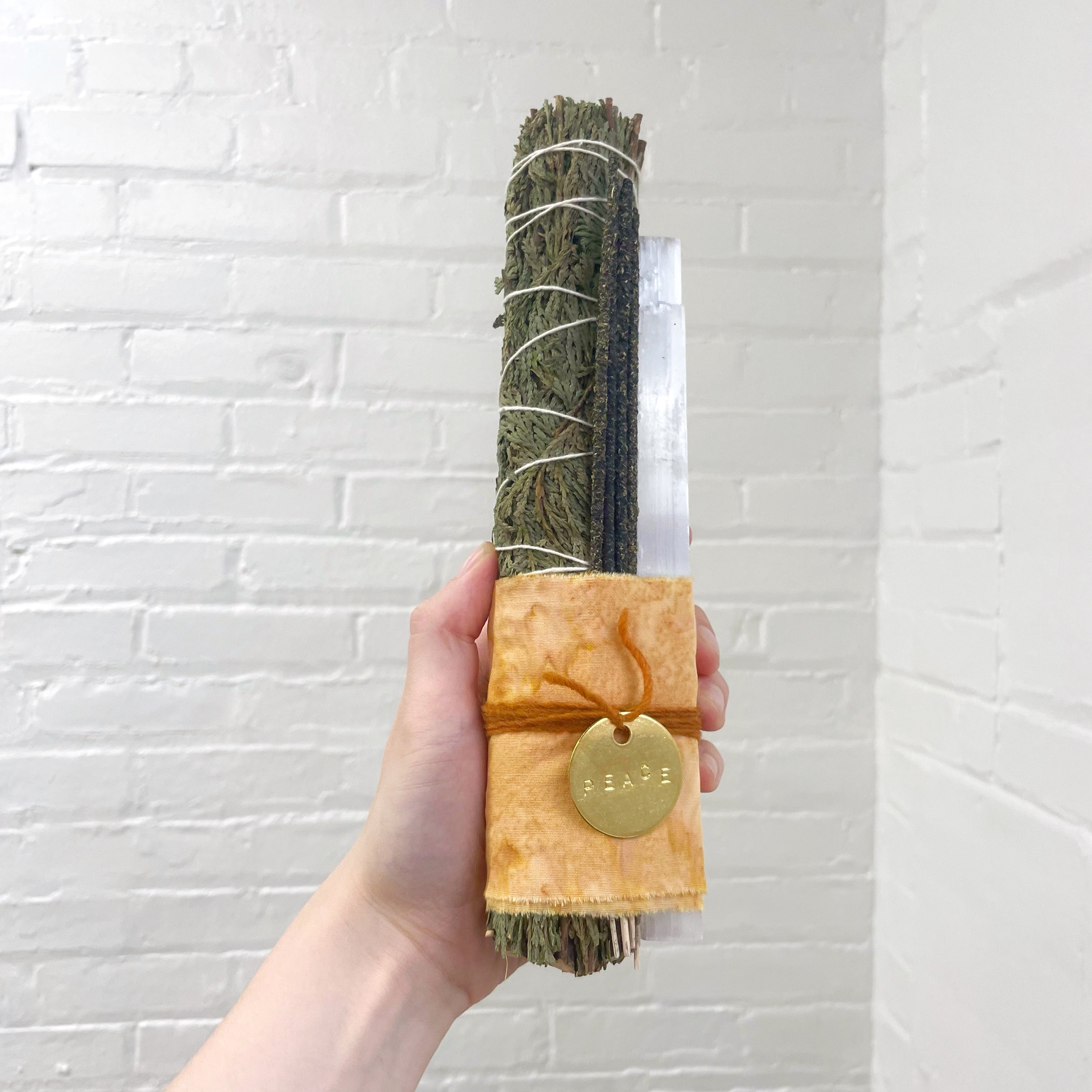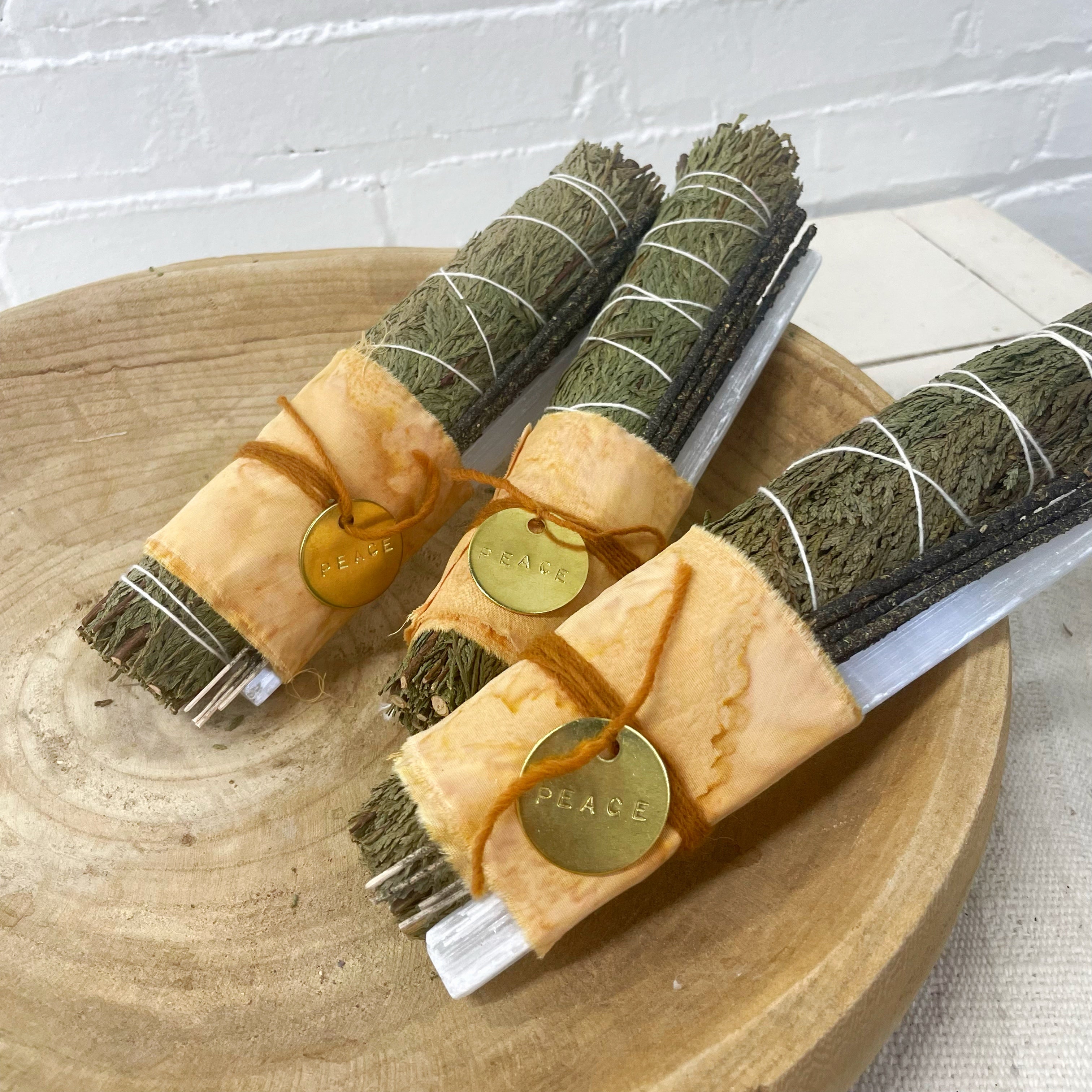 Our Updated Large Cedar Peace Bundle is a nine inch cedar bundle wrapped up with a large selenite wand, palo santo stick incense, and a hand-stamped brass tag, which says “PEACE”, handmade in our Rochester, NY studio. Every bundle has a unique look, no two are exactly alike, the yarn in particular my vary. Each one is wrapped in vintage yarn and fabric that is purchased from a local non-profit which sells vintage and deadstock sewing and crafting materials, where proceeds go back to the community, providing sewing and textile-based classes, as well as job training. Every Catherine Rising piece is assembled with care, by hand, by our close-knit team. While we do our best to keep stock of each product on hand and ship out orders as quickly as possible, we ask that you please allow one to three weeks for turnaround time.